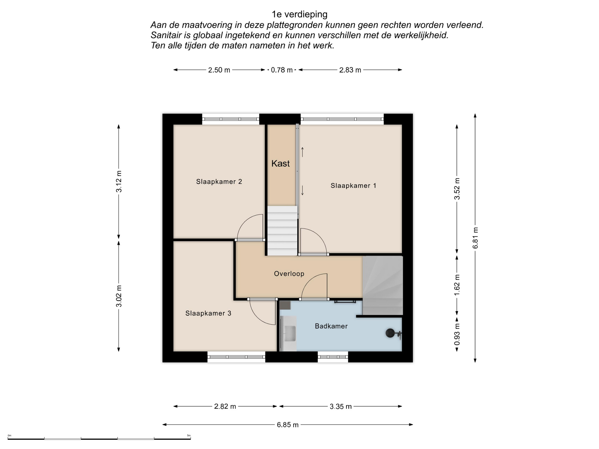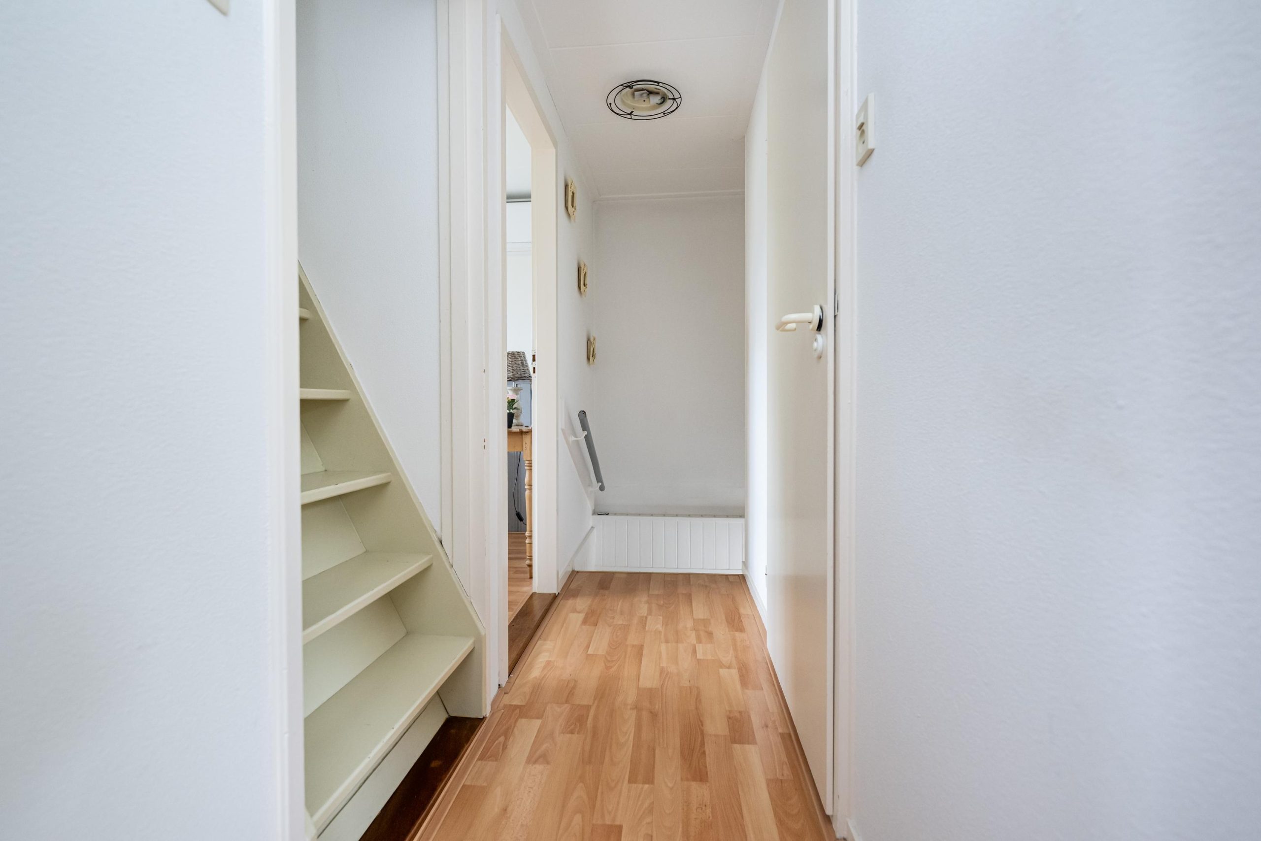 Overloop, 3 slaapkamers en badkamer, vaste trap naar 2e verdieping.