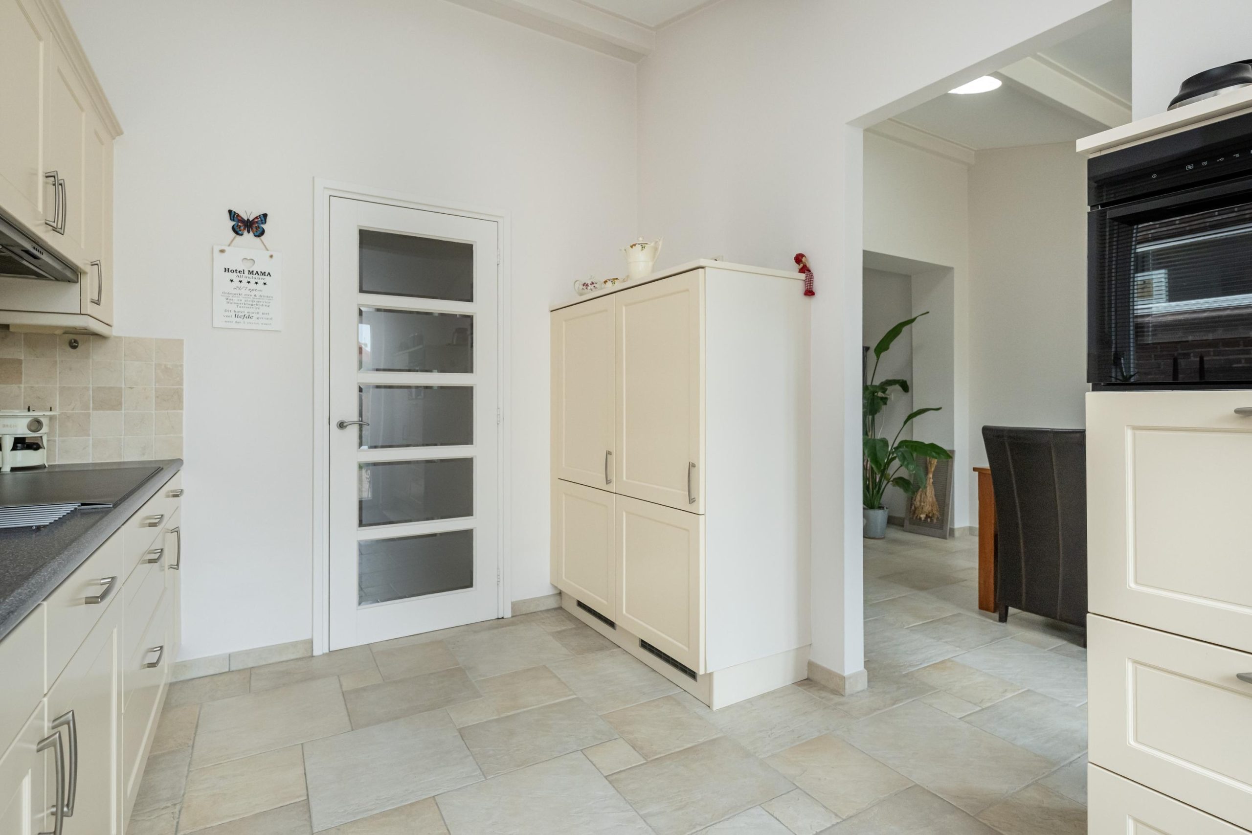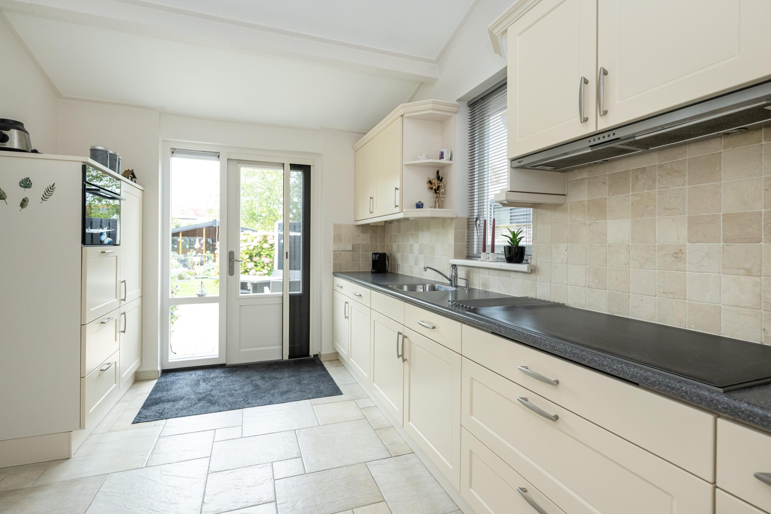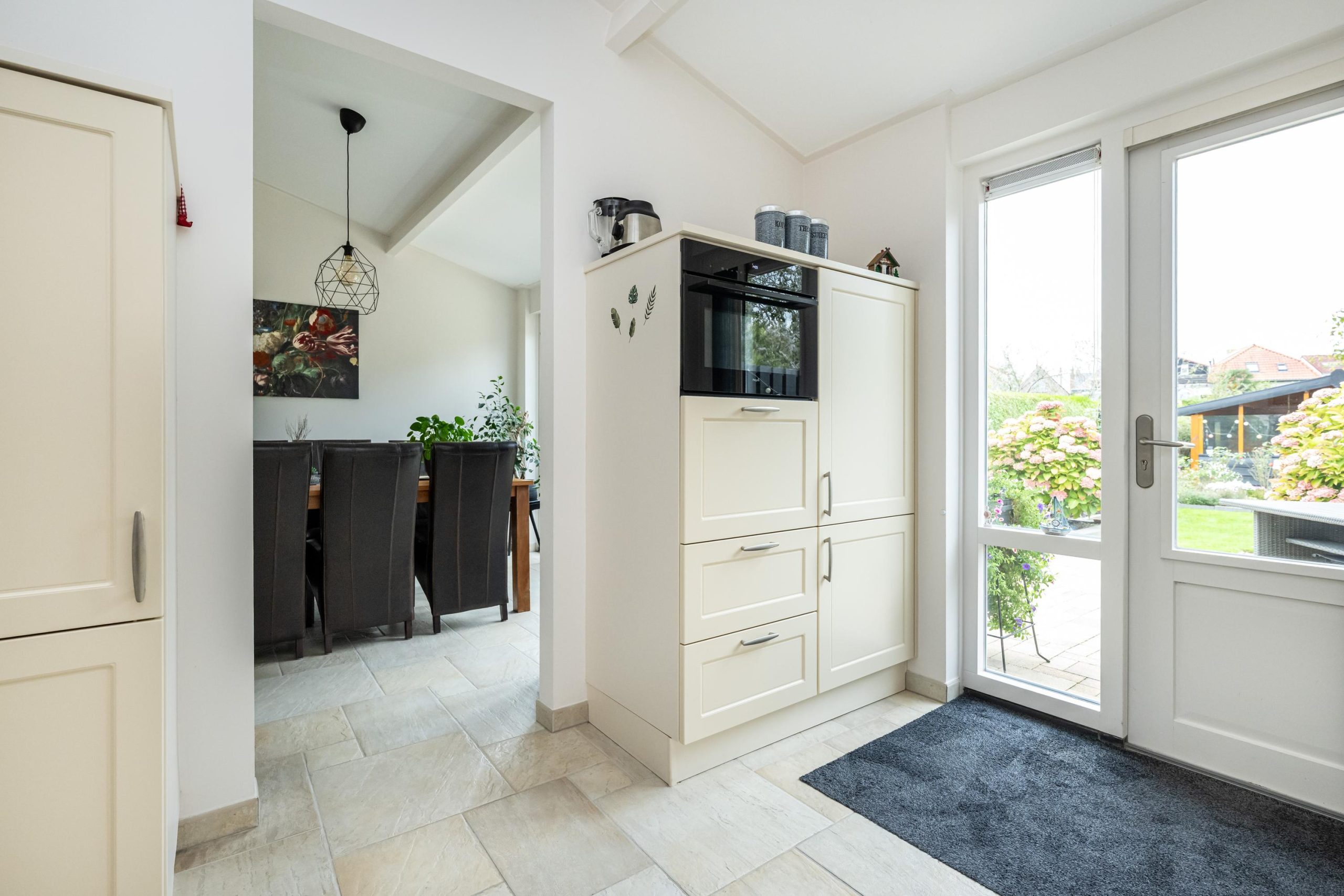 Toegang tot ruime keuken (3.70mx2.90m) voorzien van moderne keuken met kunststof aanrechtblad, spoelbak, vaatwasser, combi-/oven magnetron, 5-pits inductie kookplaat en koel-/vriescombinatie.