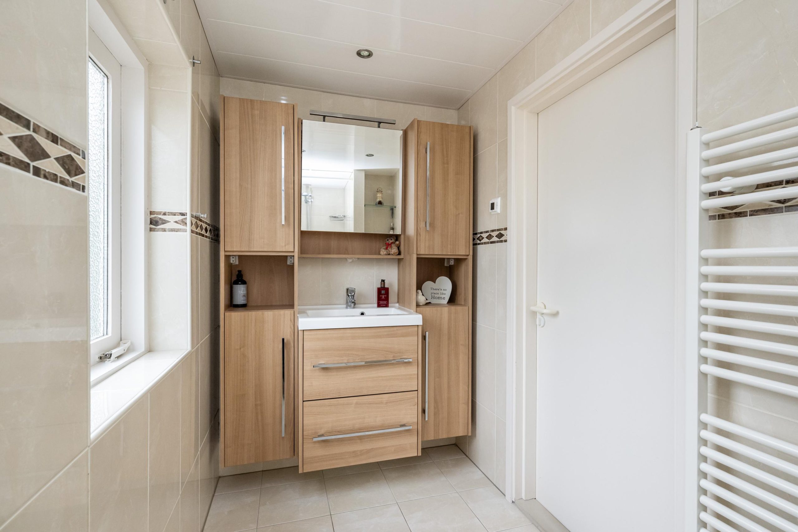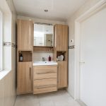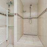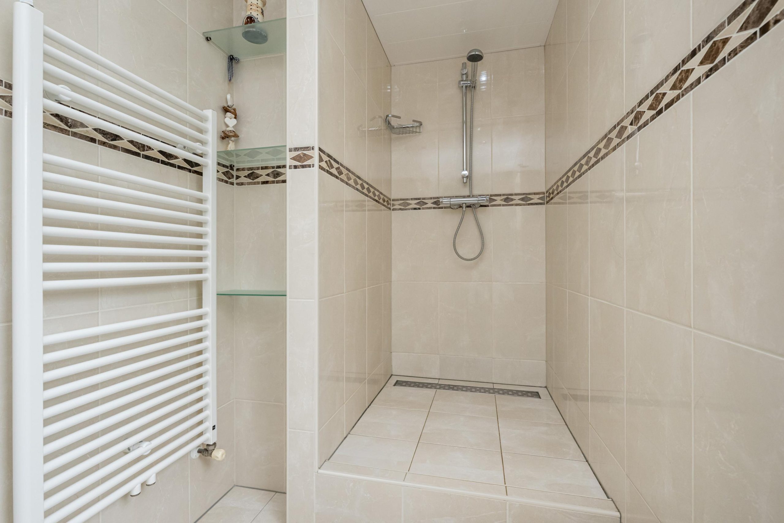 Nette badkamer (ca.3.00mx1.40m) met ruime inloopdouche, wastafelmeubel, handdoek design-radiator en vloerverwarming. Het geheel ziet er verzorgd uit!