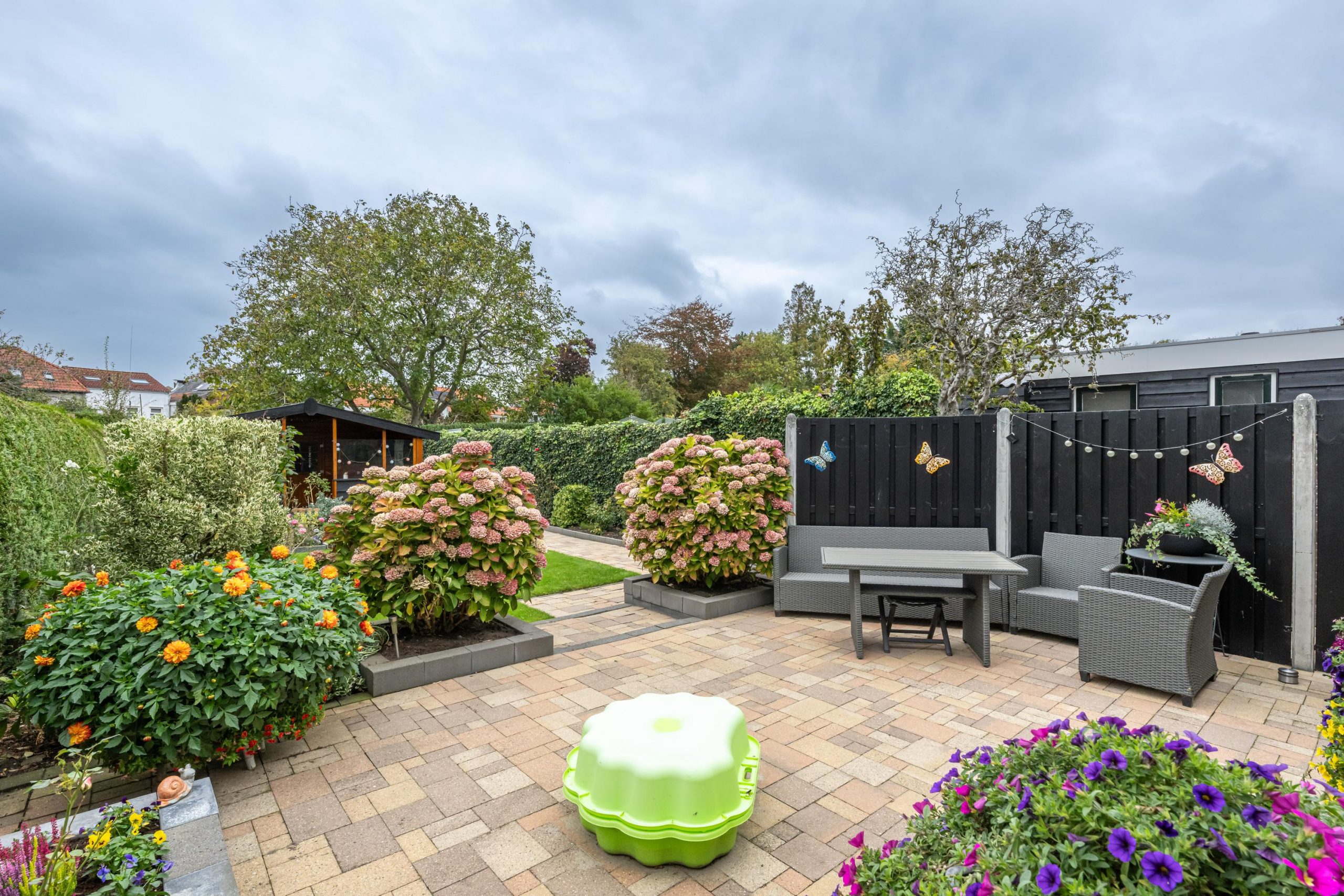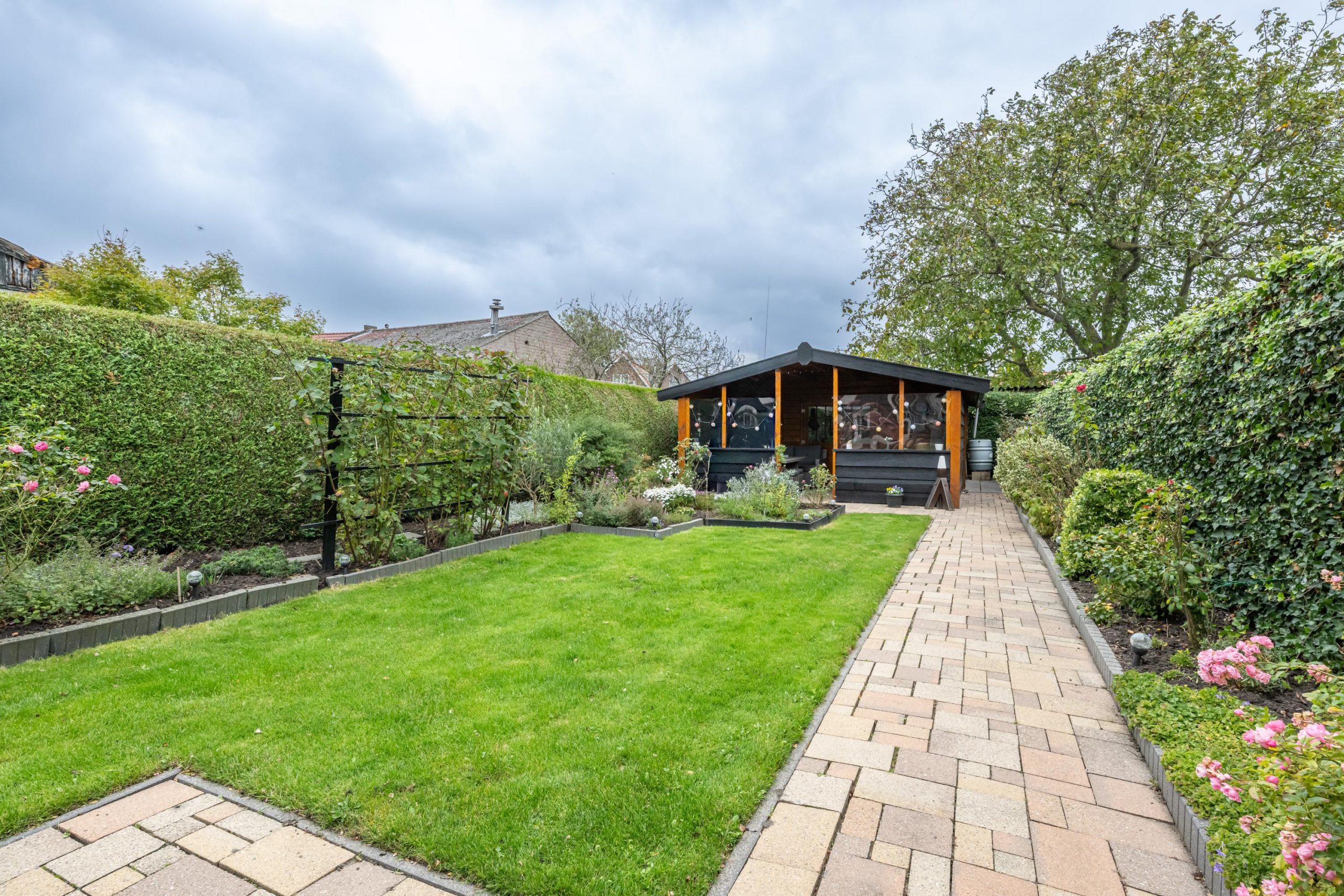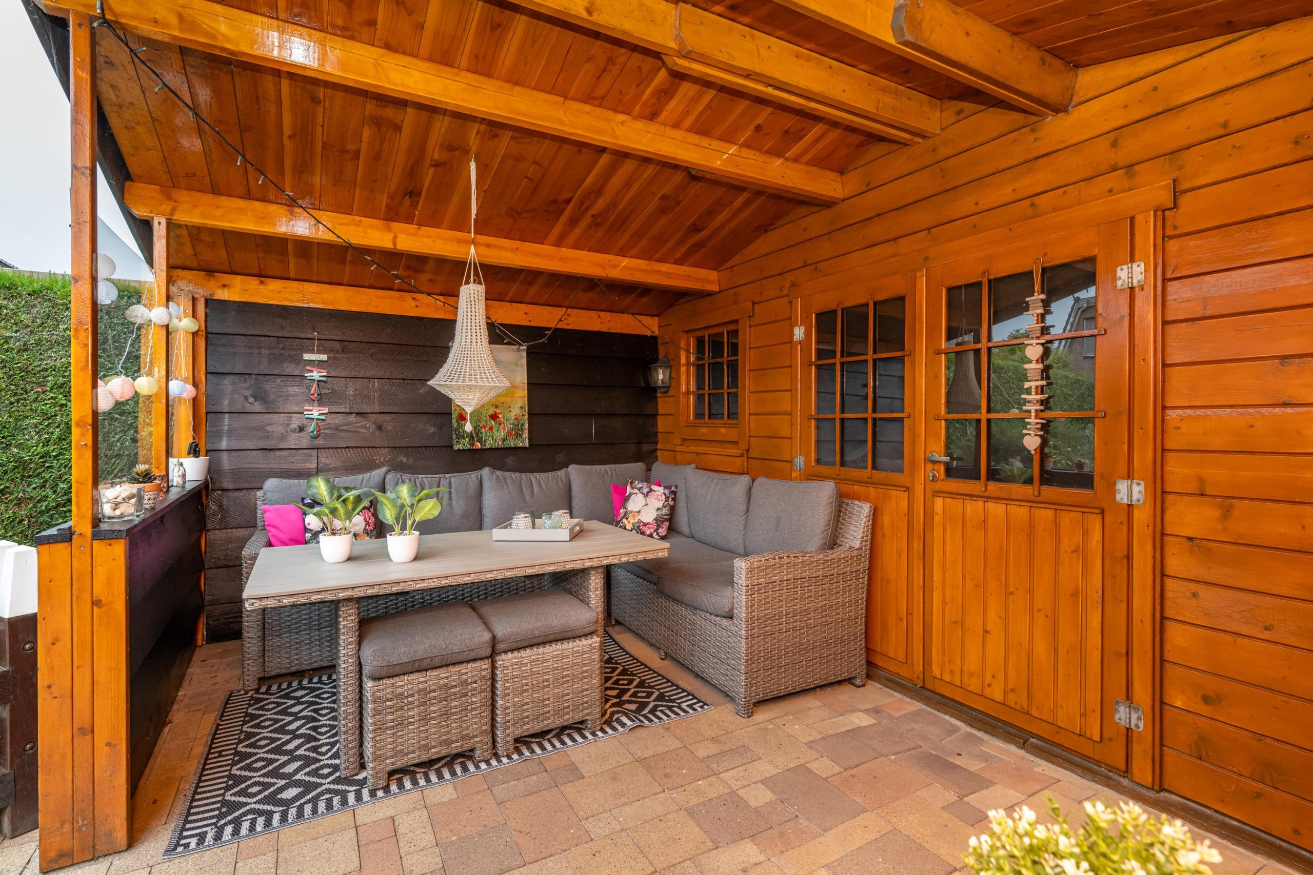Zeer ruime zonnige achtertuin met ruime blokhut en overdekte lounge. Hier kunt u heerlijk genieten in alle rust en privacy.