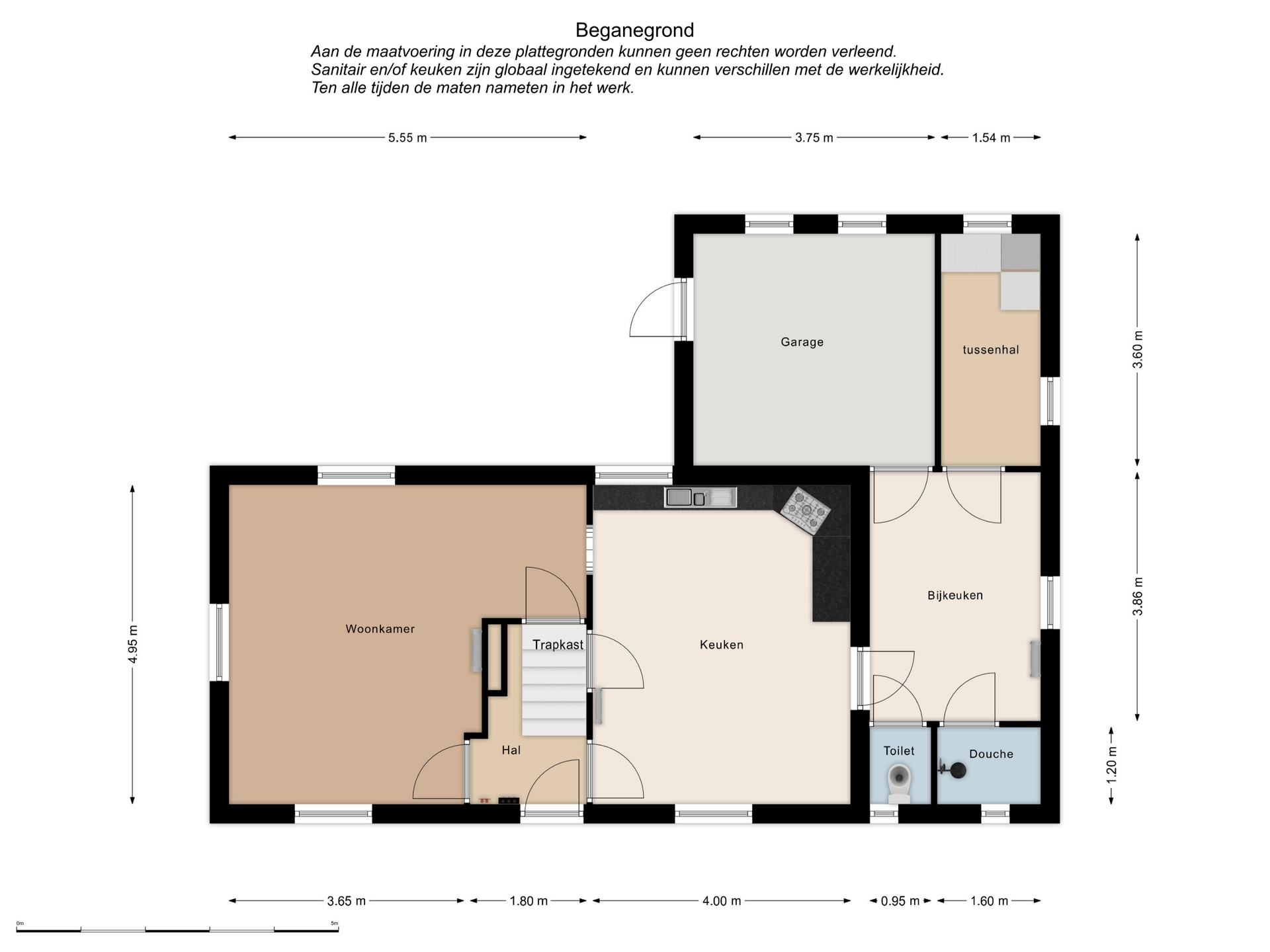 Entree/hal (1.90mx1.50m), meterkast, garderobe, vaste trap naar 1e verdieping. Vanuit hal toegang tot de woonkeuken (4.95mx4.00m) met gashaard,