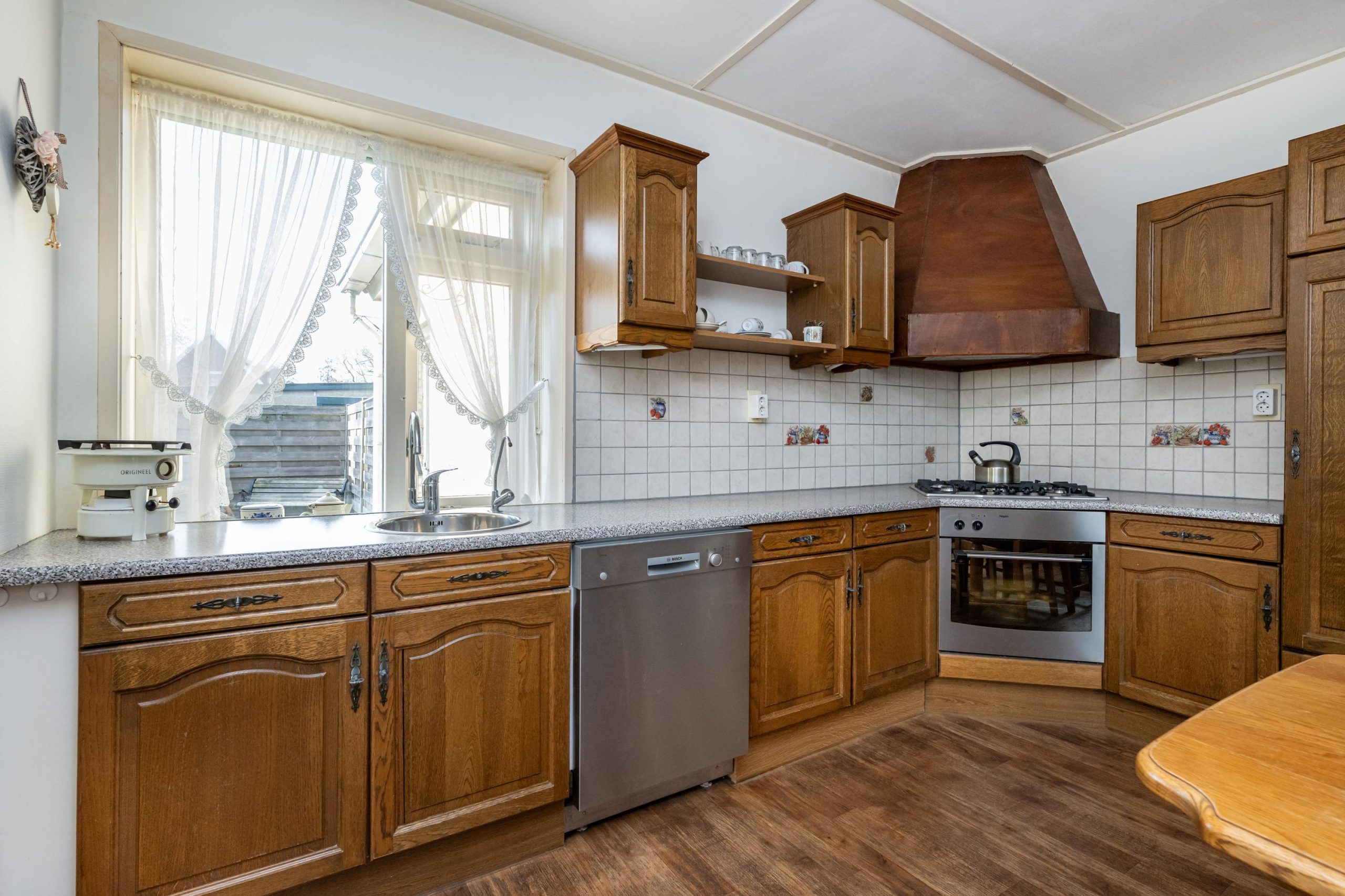 hoekkeuken voorzien van kunststof aanrechtblad met spoelbak, vaatwasser, gascomfort met elektrische oven, afzuigkap, koelkast met vriesvak.