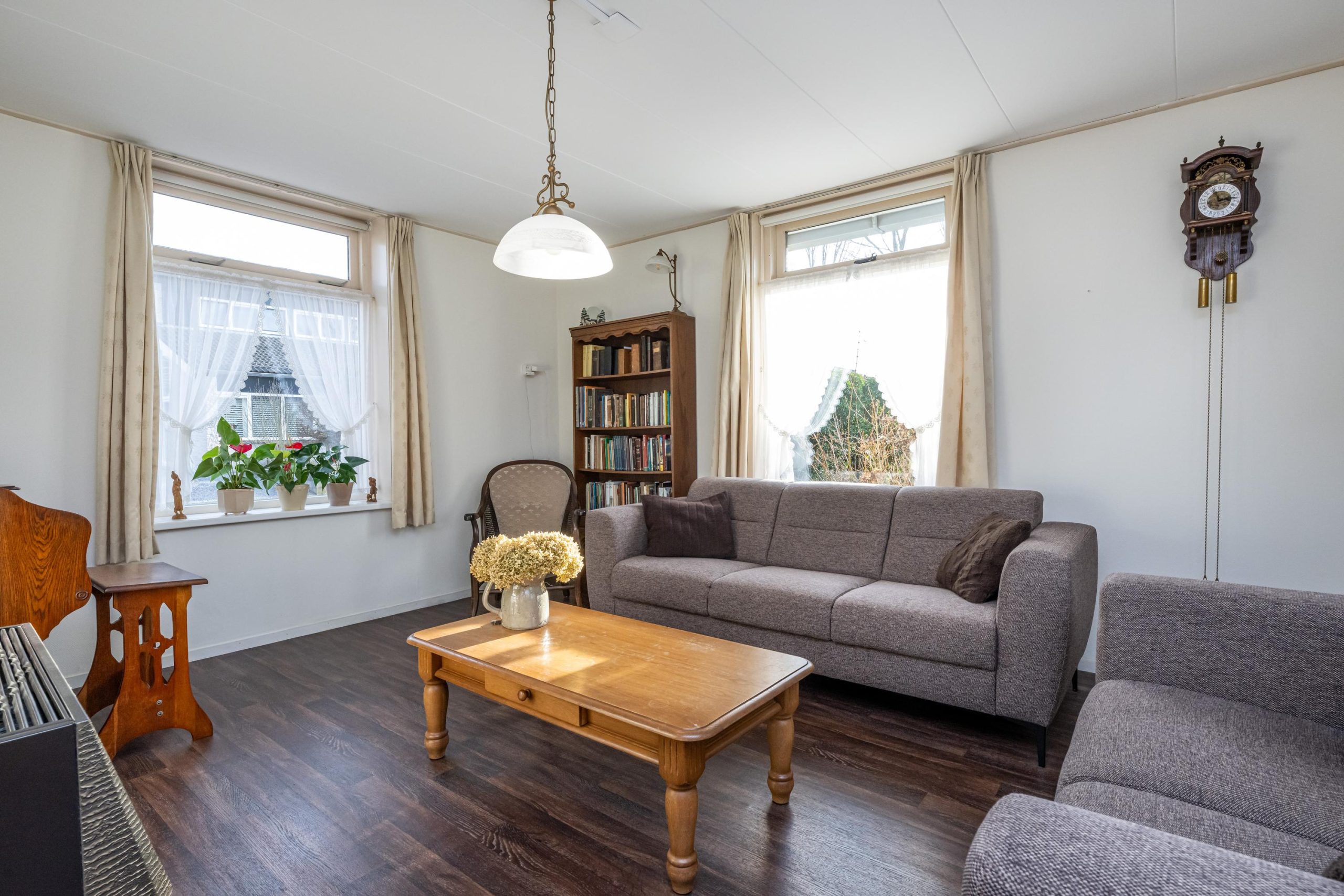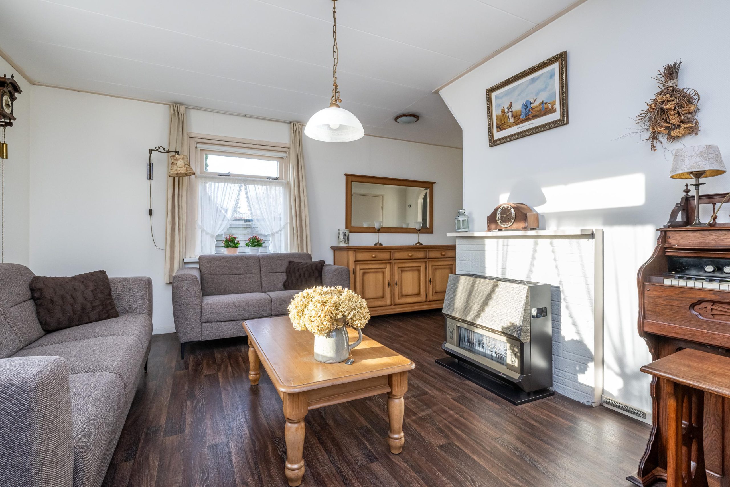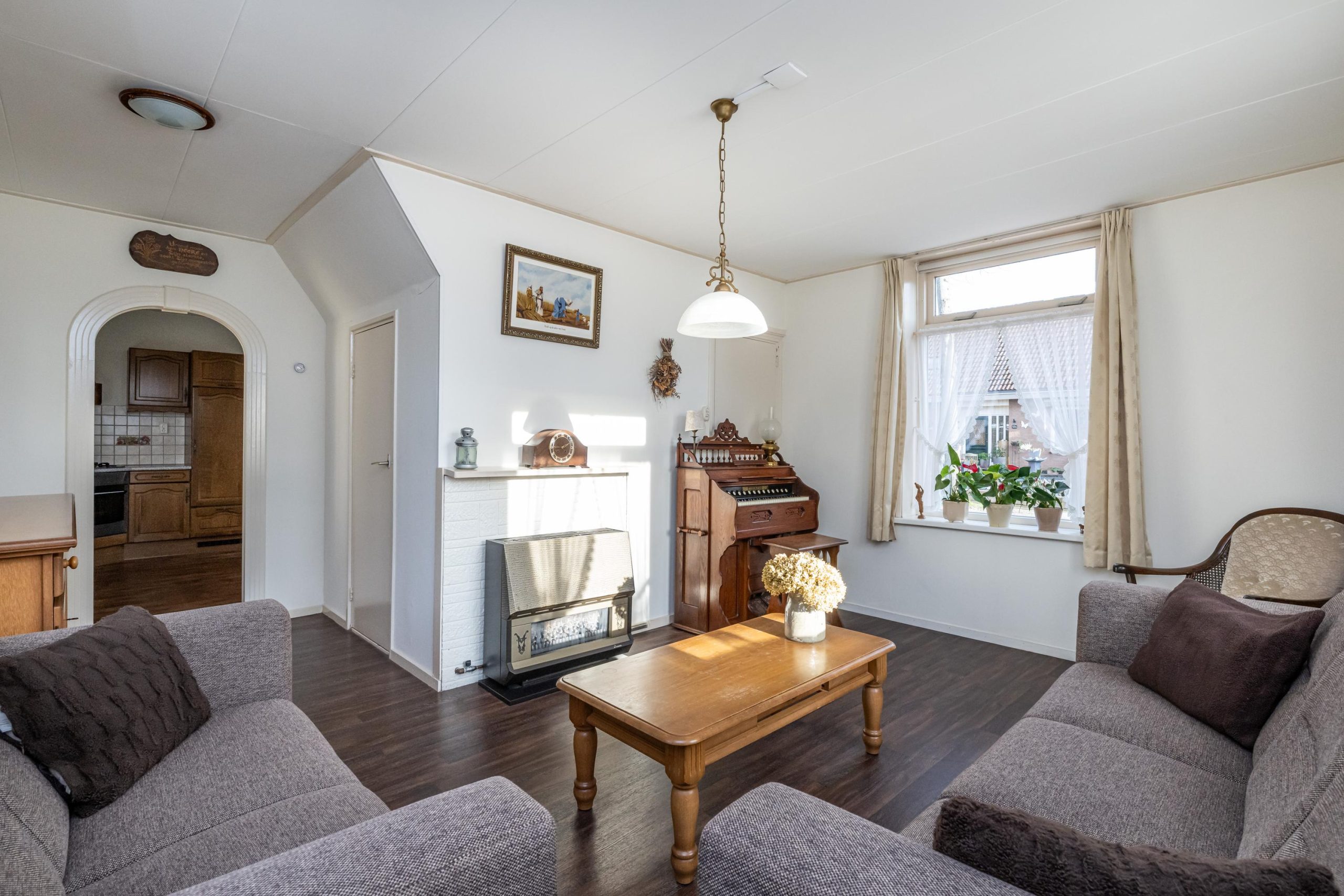 Toegang tot woonkamer (4.95mx5.55m) met gashaard. Opvallend is de heerlijke lichtinval!