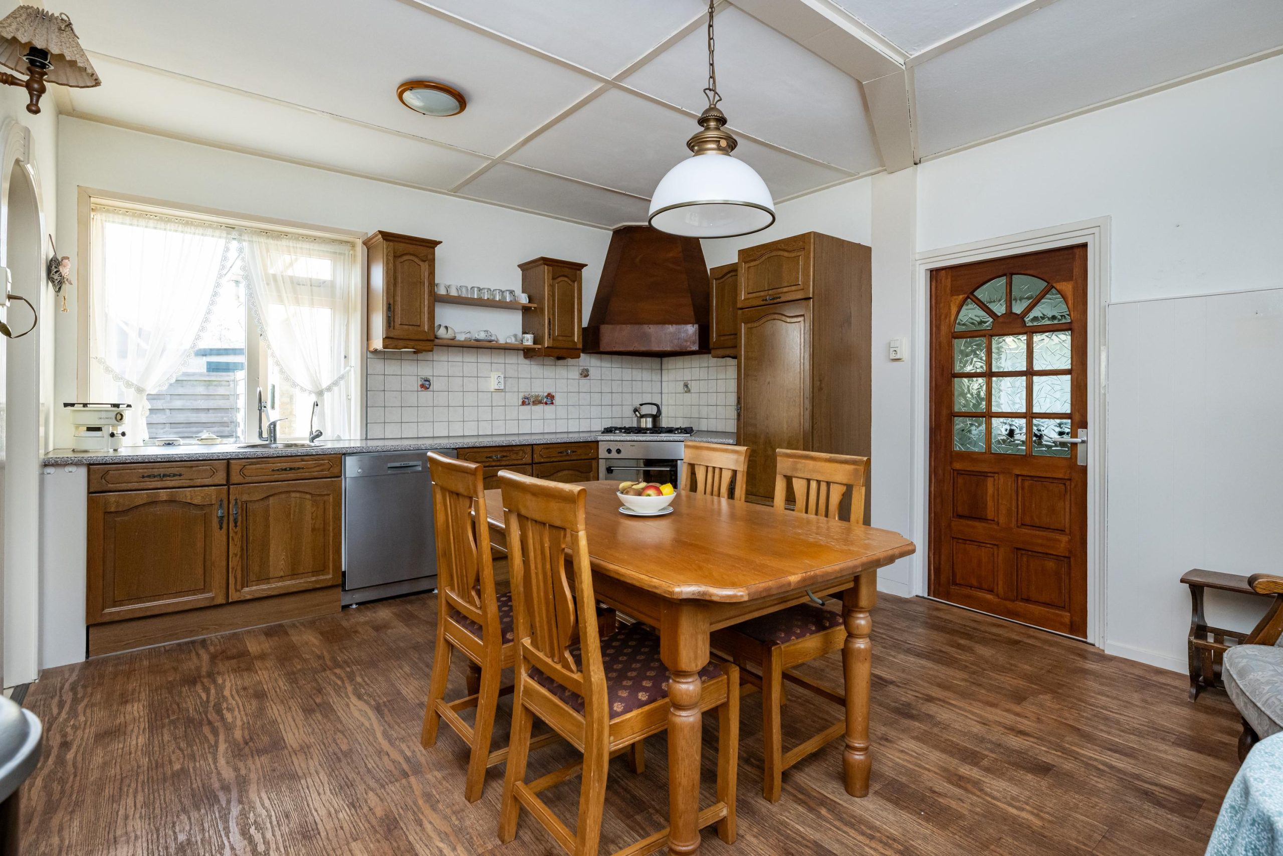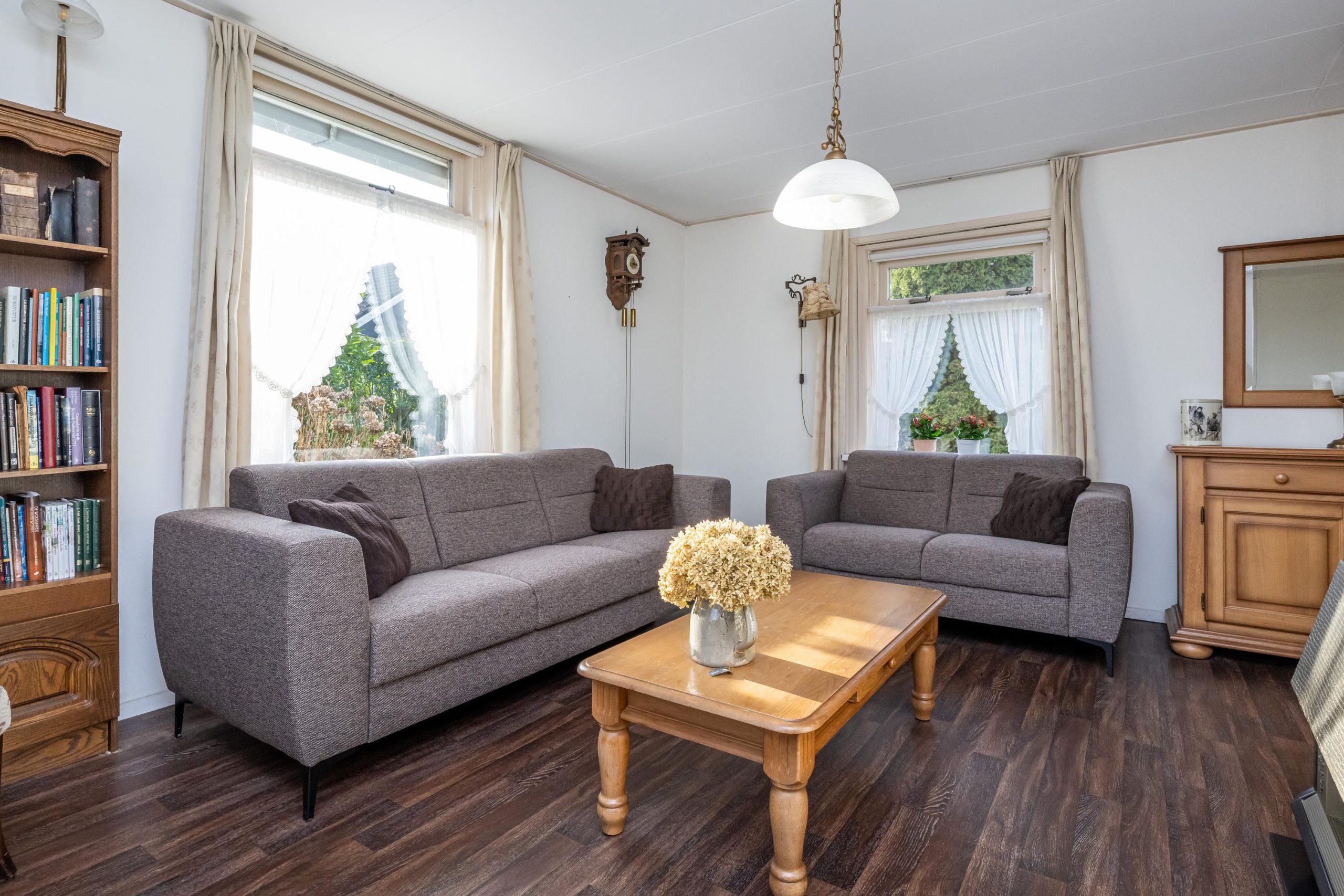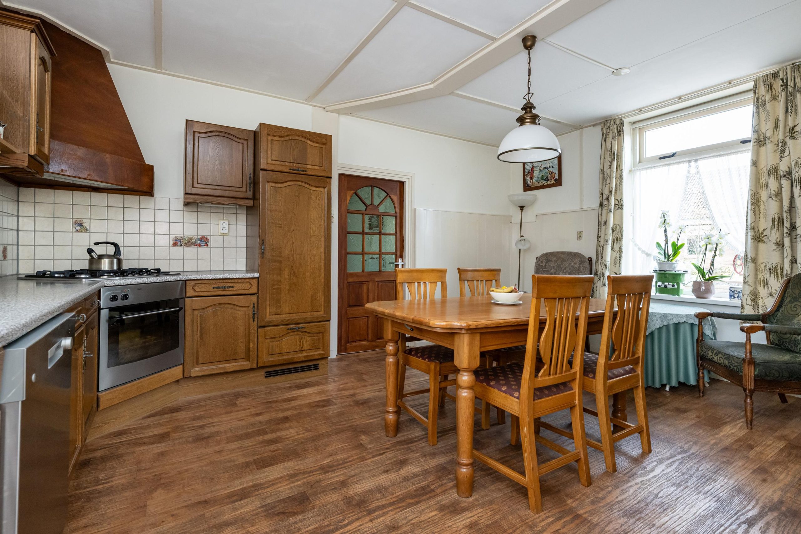 Toegang tot woonkamer (4.95mx5.55m) met gashaard. Opvallend is de heerlijke lichtinval!