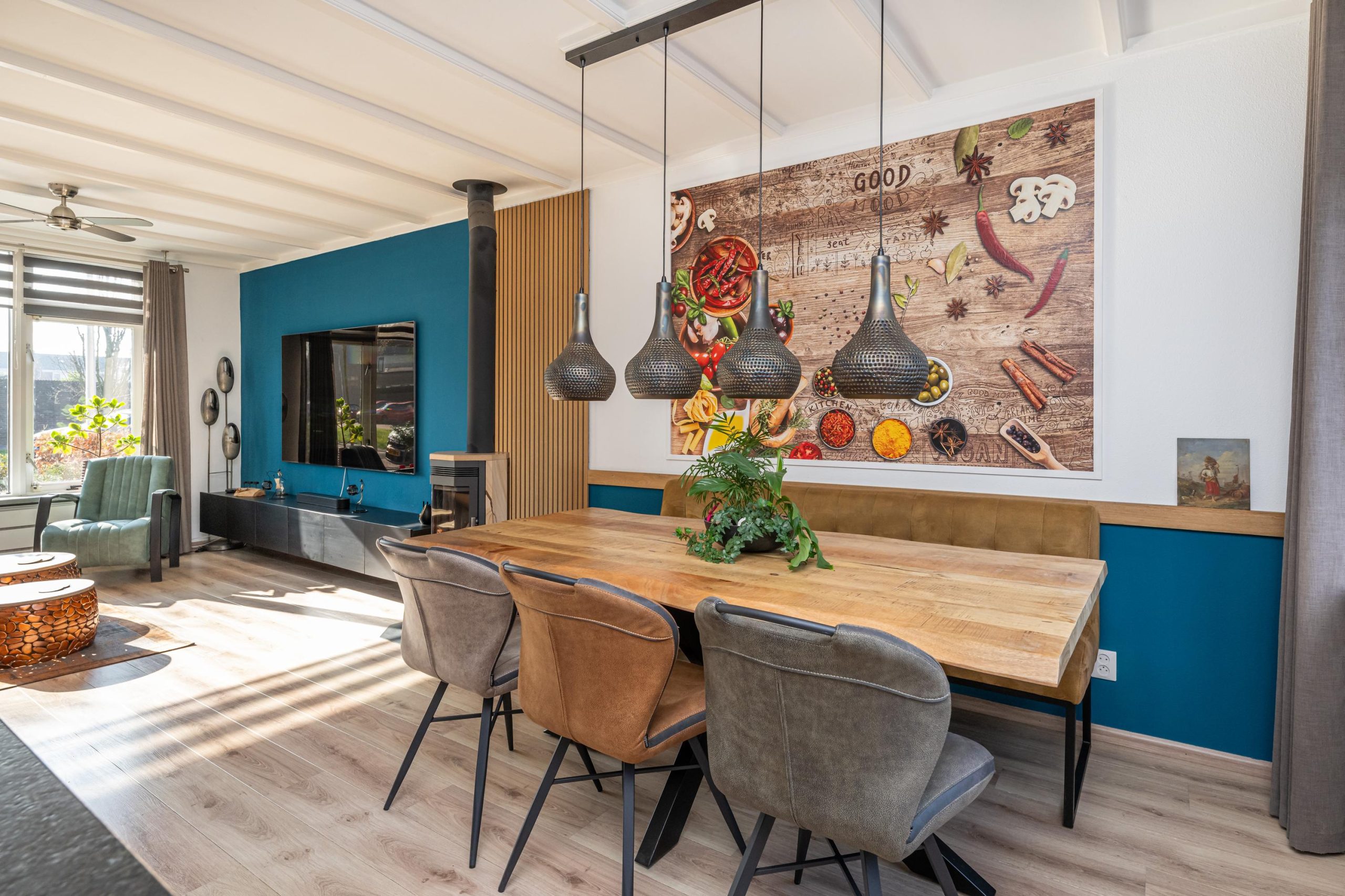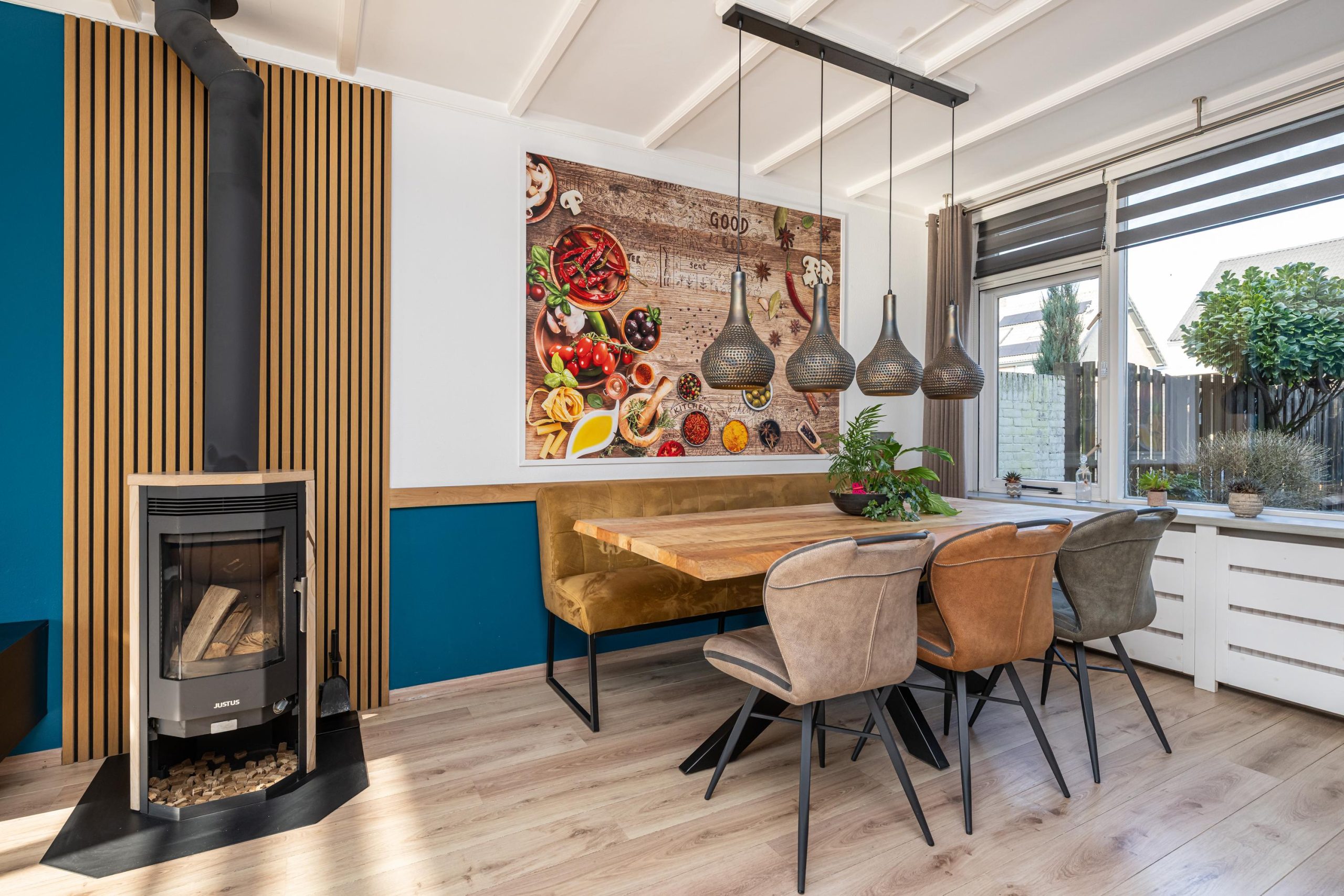 eetgedeelte aan achterzijde en verbinding met de open keuken. Electrische zonwering voorzijde.