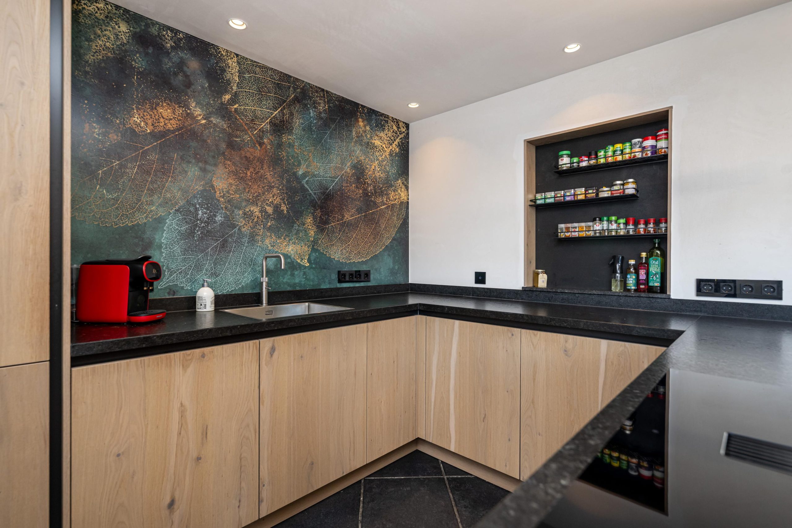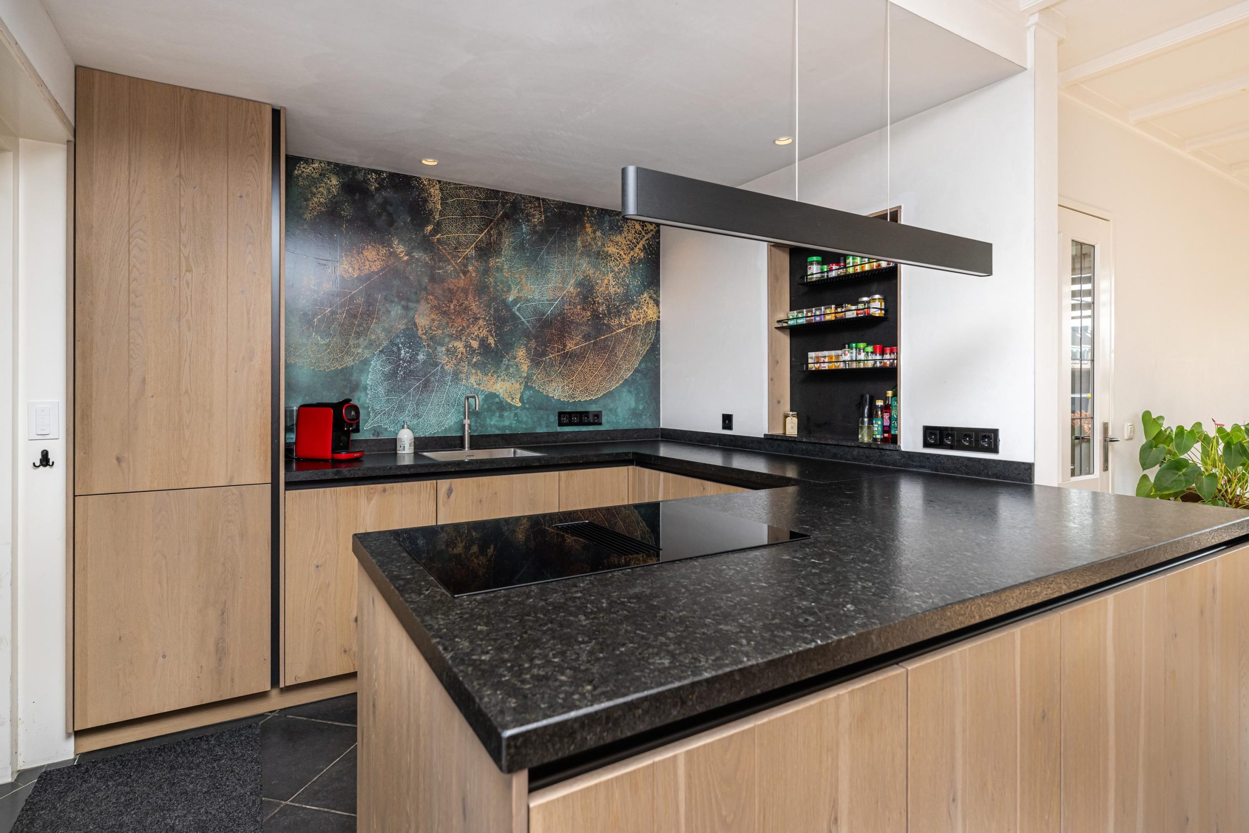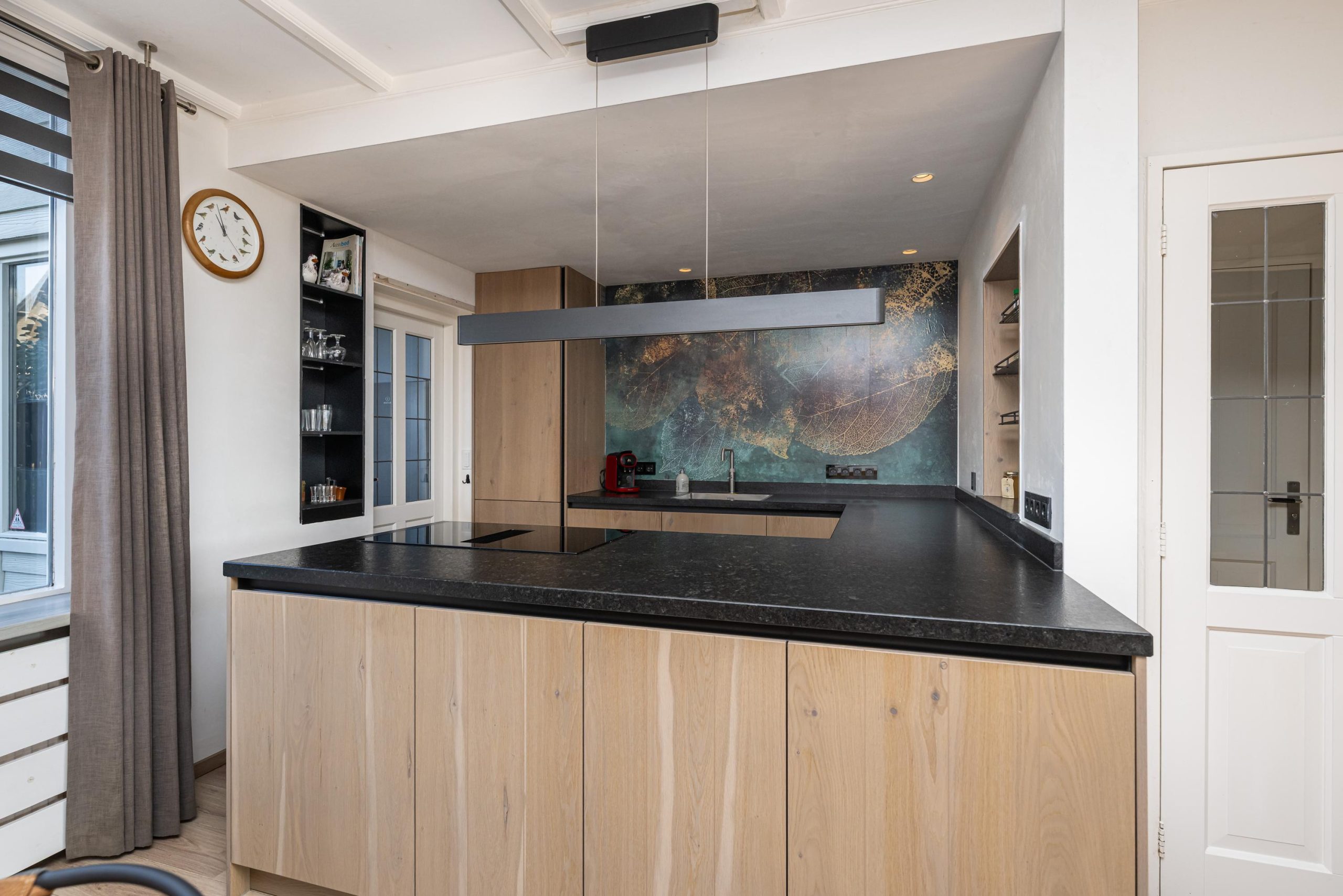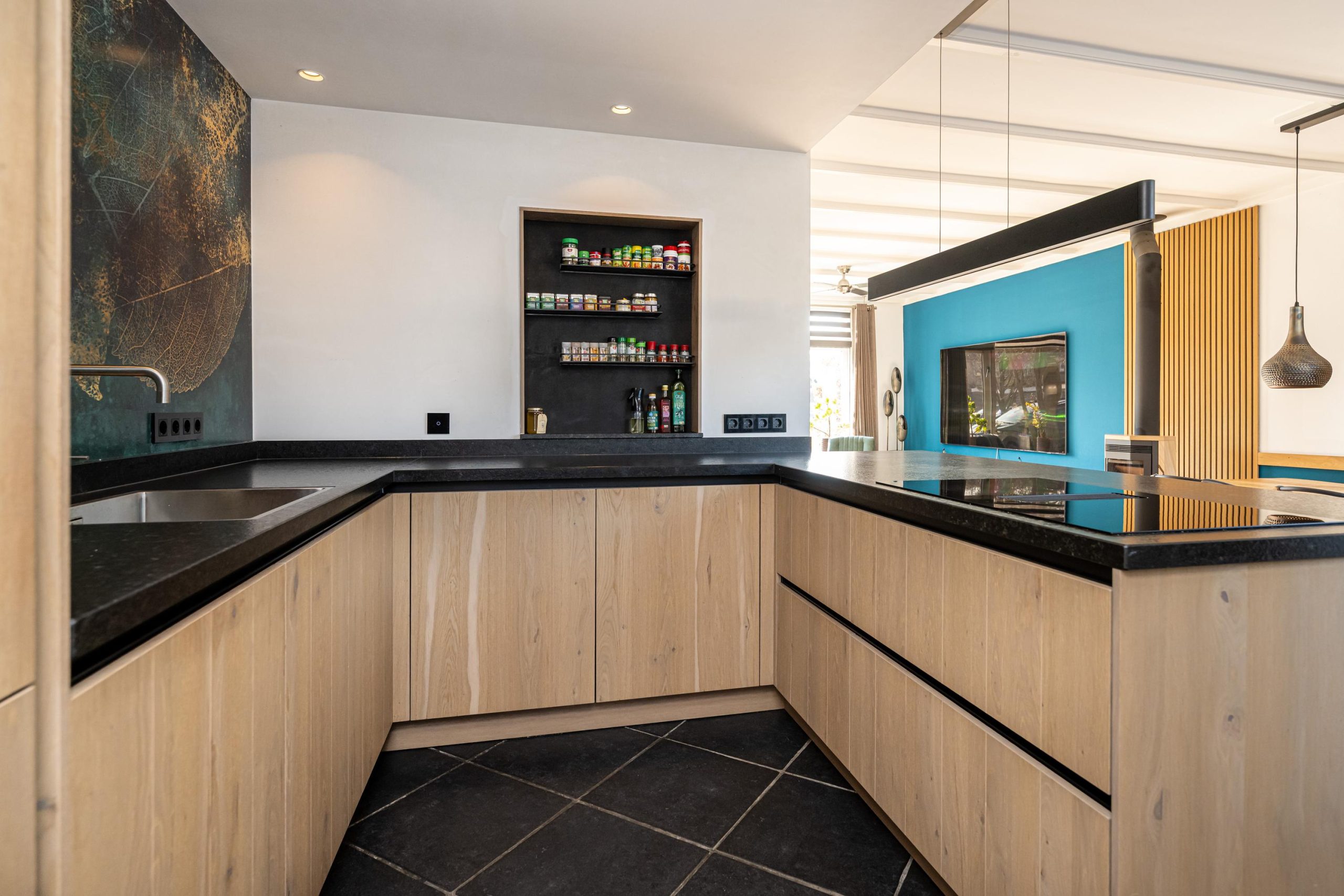 Zeer luxe Tieleman keuken (2022) voorzien van natuursteen aanrechtblad, spoelbak, quooker, inductie-kookplaat met integraal novy afzuigcomfort, riante Siemens koelkast, Siemens vaatwasser, quooker en veel bergruimte.