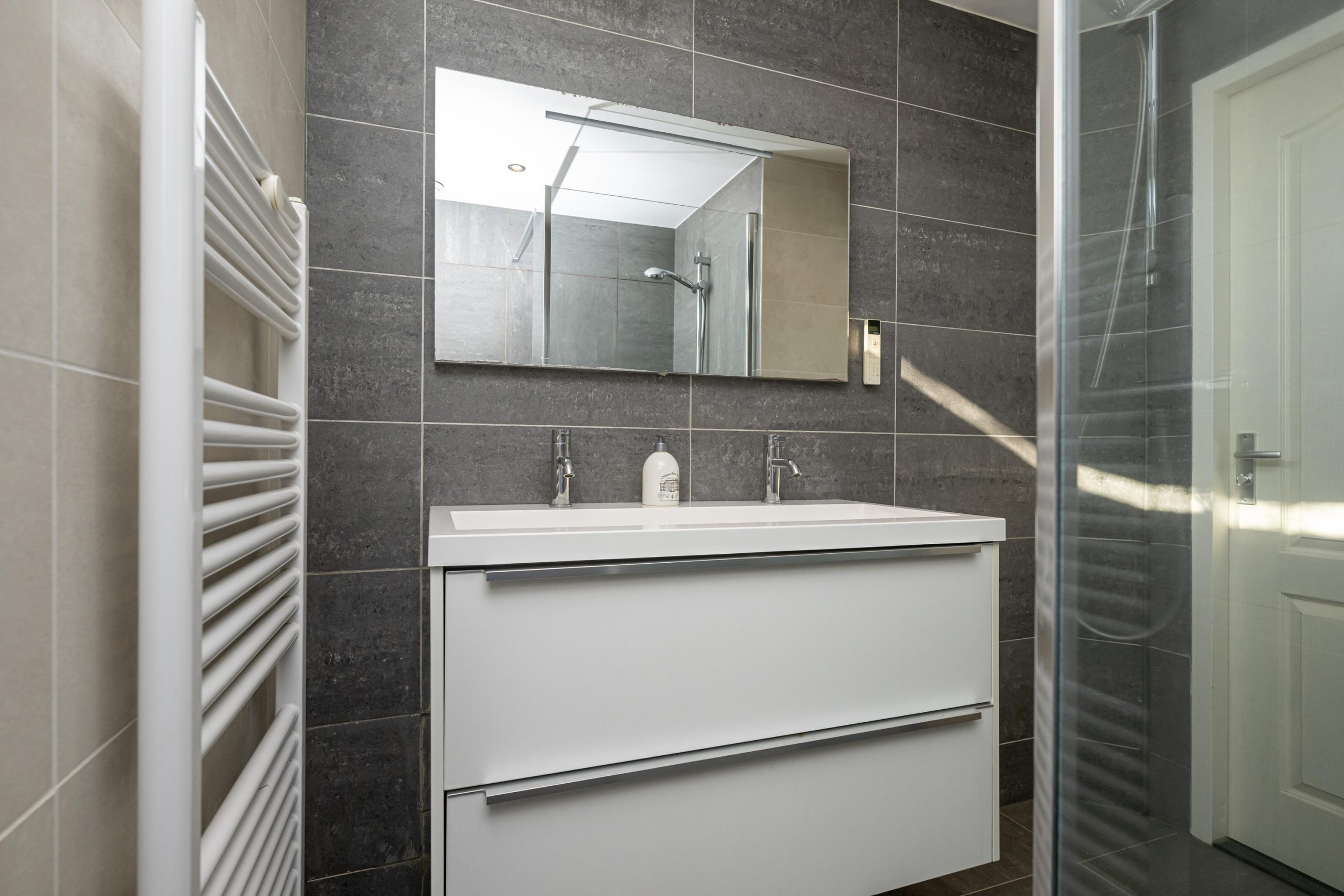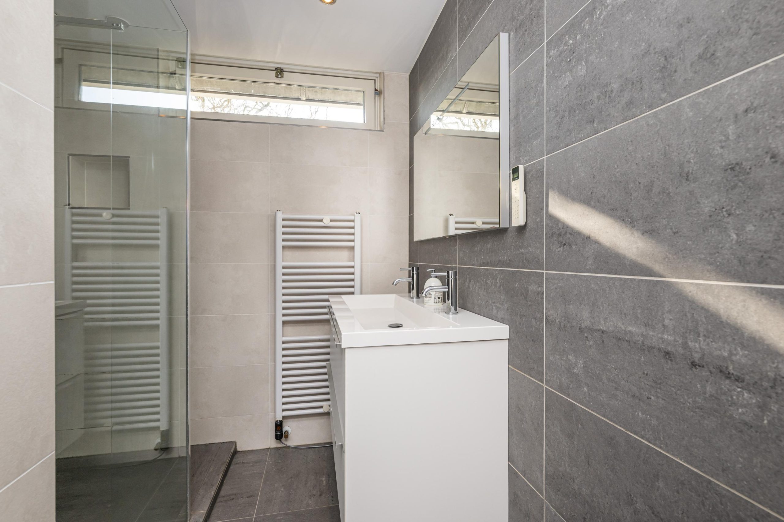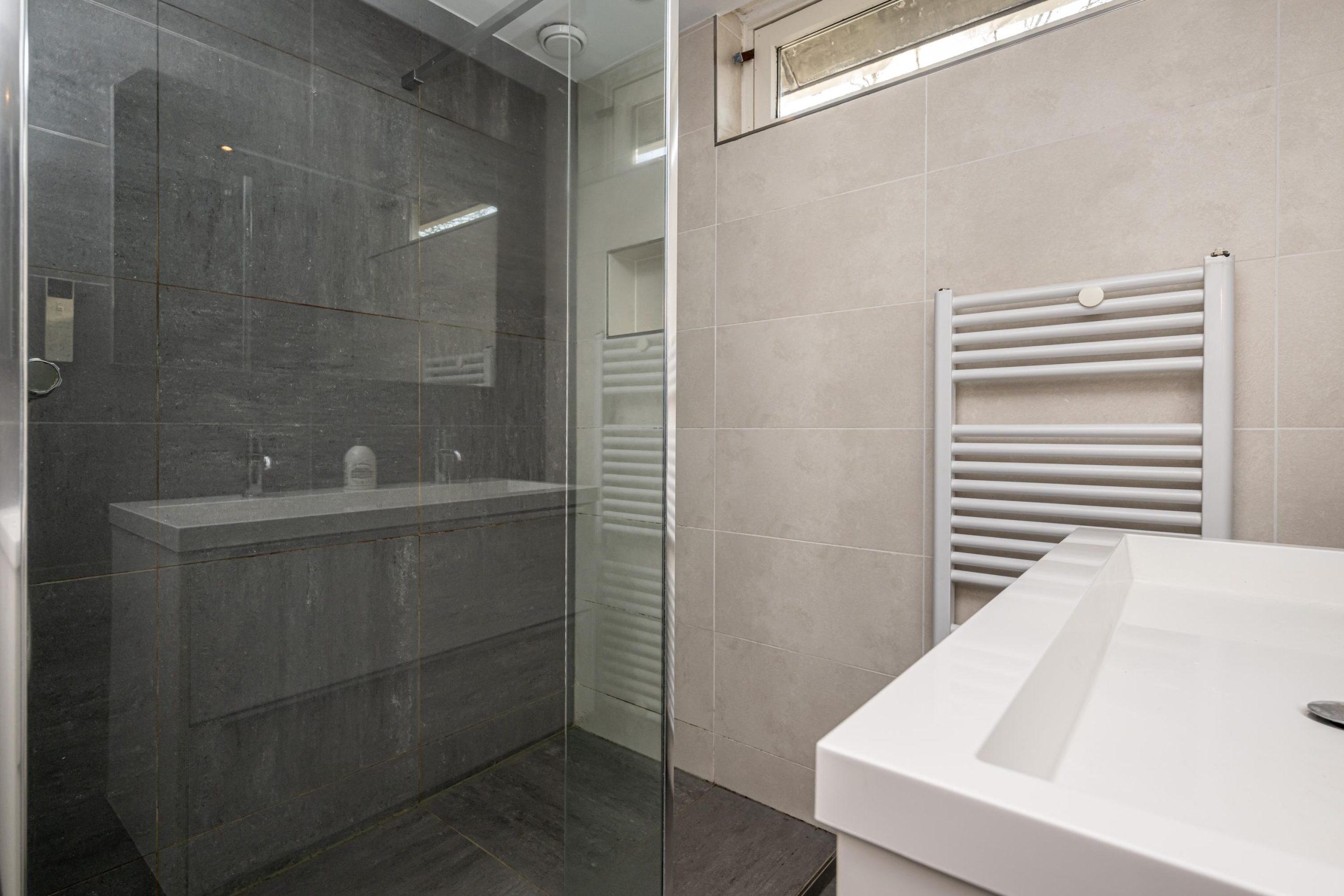 Moderne badkamer, (2.18mx2.00m), voorzien van ruime inloopdouche voorzien van stort-/handdouche, wastafelmeubel, design-radiator, inbouwspots en mv. Het geheel ziet er verzorgd uit!