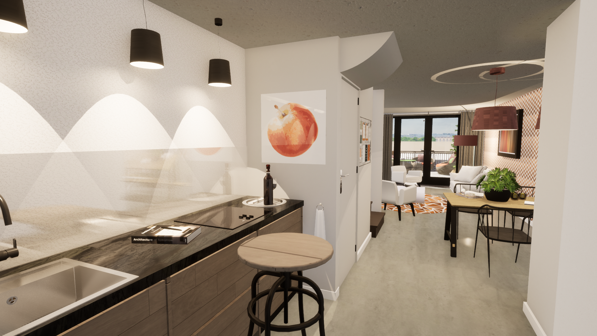 • Ruime woonkamer met open keuken en directe verbinding naar het dakterras.